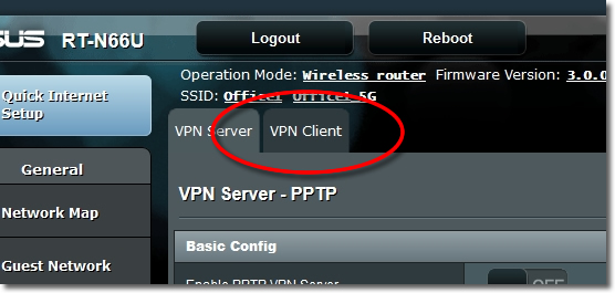 Login to your ASUS router adminstration and from the ‘Advanced Settings’ panel go to ‘VPN’.