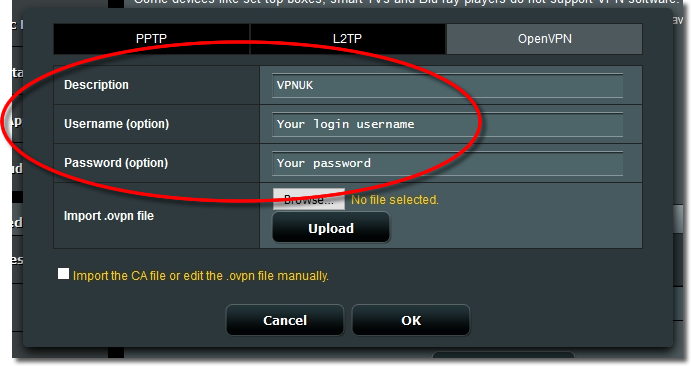 Enter any ‘Description’, as well as your VPNUK Login ‘username’ and ‘password’.