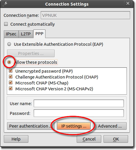 Click onto the ‘Allow these protocols’ checkbox and click onto the ‘IP Settings’ Button.