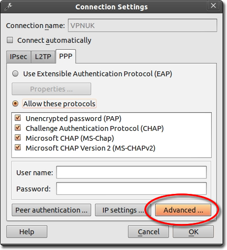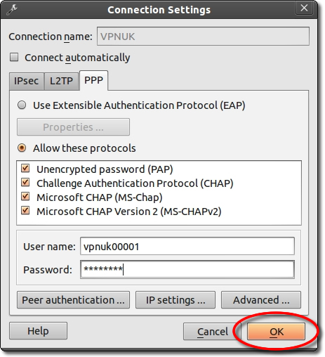 Enter the IP of the server you are connecting to and the IPSec key: 69000903 then click onto the ‘PPP’ tab. You can find the server information in your ‘Welcome to VPNUK’ email or in the ‘Client CP‘ on the VPNUK website.