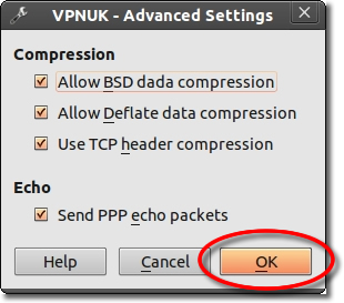 Ensure all of the compressions options are checked along with the option to send PPP echo packets, then click on ‘OK’.