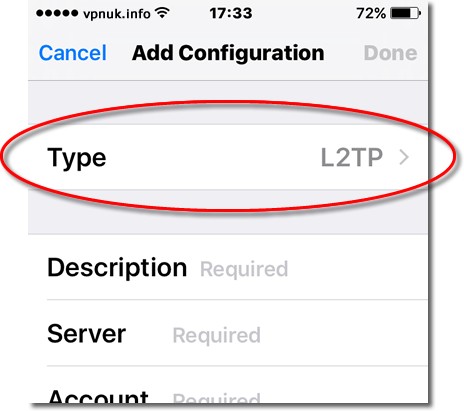 The ‘Add Configuration’ overview should now have the ‘Type’ set to ‘L2TP’.