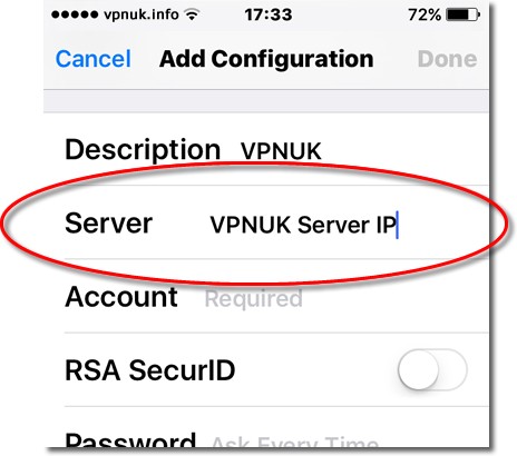 Enter a valid VPNUK server IP or Server DNS name into the ‘Server’ field. If you have an account on the Shared IP platform you can enter any VPNUK Shared IP server details into the field, Accounts on the Dedicated IP platform should enter the server Connecting IP. You can find the server information in your ‘Welcome to VPNUK’ email or in the ‘Members Area‘ on the VPNUK website.