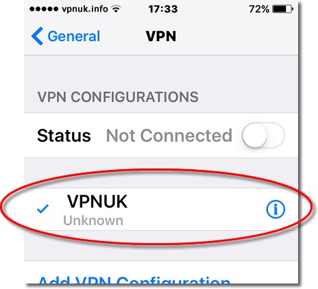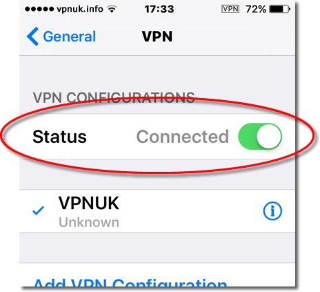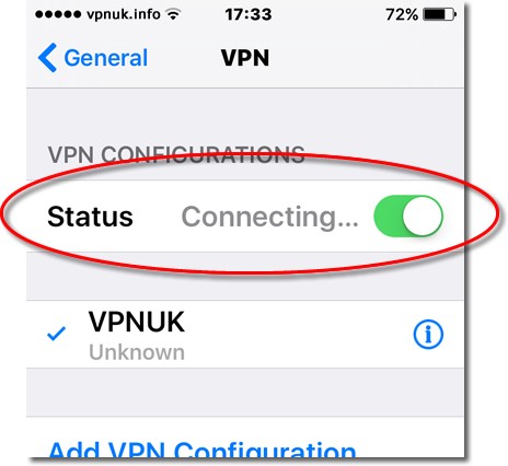 Note: If the connection fails for any reason you should click onto the VPNUK connection ‘i’ and then ‘Edit’. You should then ensure all of the settings are all correct. Please ensure the server, login and secret details are all correct and do not contain any uppercase letters or white spaces.