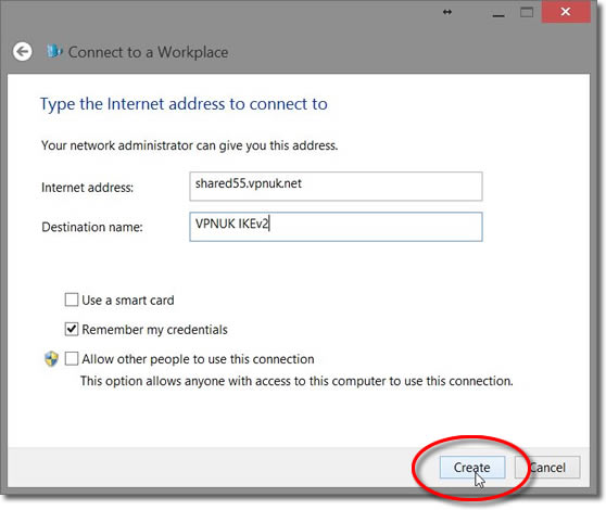 Enter the server name that corresponds to the certificate you installed into the Internet address field and a friendly name for this connection into the Destination name field. Clients on the Dedicated IP platform should enter the server their unique IP address corresponds to. Place a tick in the checkbox labeled ‘Remember my credentials’, then click the ‘Create’ button. You can find the server information in your ‘Welcome to VPNUK’ email or in the ‘Client CP‘ on the VPNUK website.
