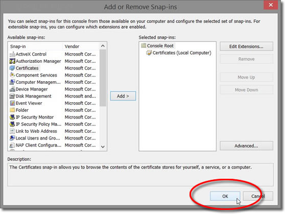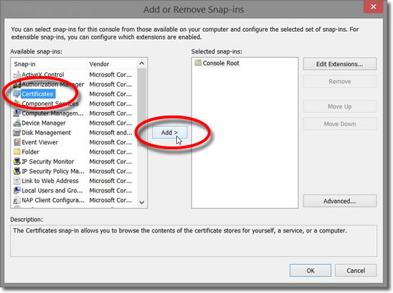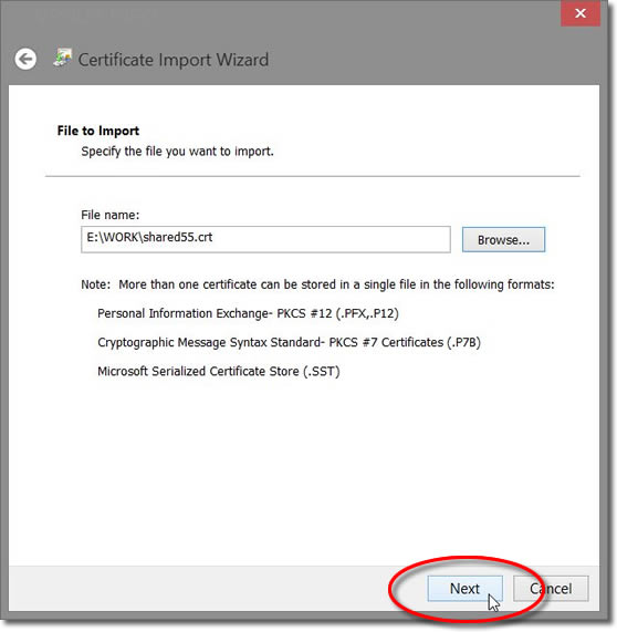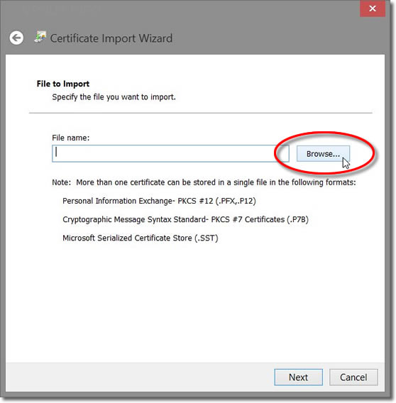 You now need to seclect the certificate file, click onto the ‘Browse’ button.