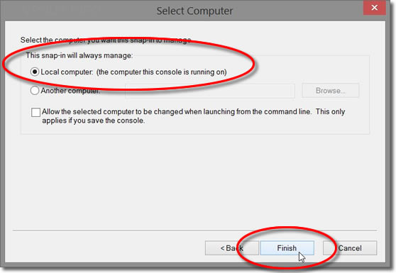Ensure the snap-in will always manage ‘Local computer’ then click onto the ‘Finish’ button.