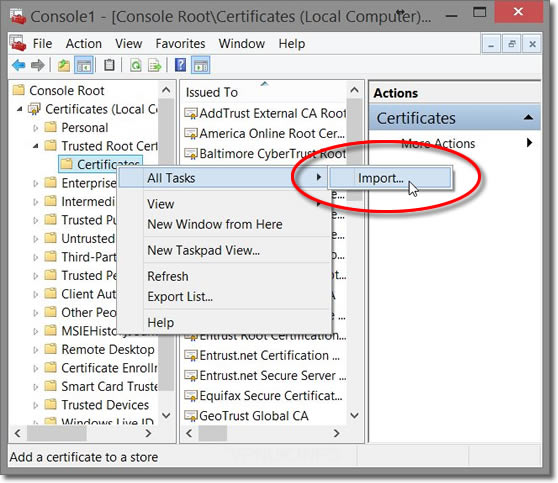 From the ‘Console Root’ expand ‘Certificates (Local Computer)’ option, then expand ‘Trusted Root Certification Authorities’ and right click onto ‘Certificates’ then choose ‘All Tasks’ > ‘Import’.