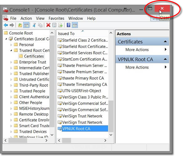 From the ‘Console Root’ expand ‘Certificates’ then ‘Trusted Root Certification Authorities’ and click onto ‘Certificates’. You should now see the ‘VPNUK Root CA’ certificate in the list of available certificates.