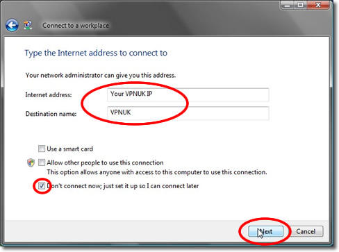 Enter the server IP and destination name. Check the box titled ‘Don’t connect now; set it up so I can connect later’ and click ‘Next’. You can find the server information in your ‘Welcome to VPNUK’ email or in the ‘Client CP‘ on the VPNUK website.