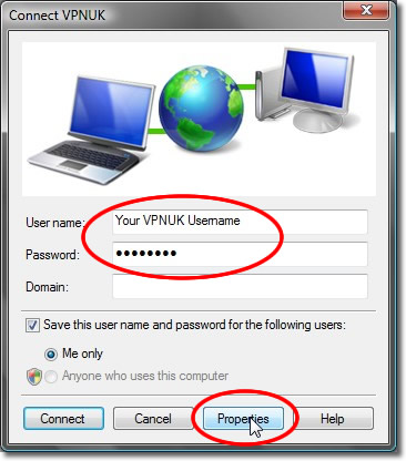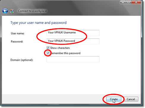 Enter your VPNUK username and password. Optionally, check the ‘Remember this password’ checkbox.