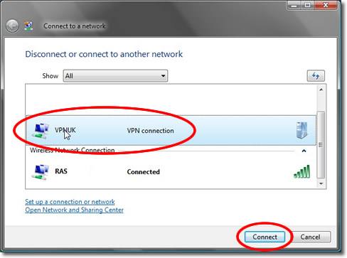 To connect to whichever vpn you have set up, go to the Start button and click onto ‘Connect To’. Then click on the VPNUK connection.
