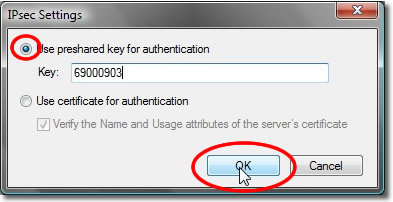 In the ‘IPsec Settings’ dialog, click the radio button labeled ‘Use pre shared key for authentication’. Then type 69000903 into the text box labeled ‘Key’. Then click the ‘OK’ button.
