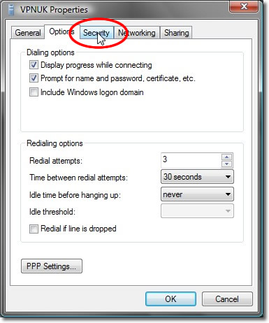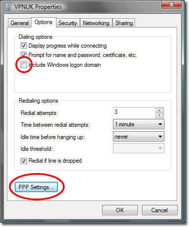 Remove the tick from the ‘Inlclude Windows logon domain’ dialing options and click onto PPP settings.