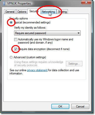 Place a check in the Typical (recommended settings), ensure the ‘Require data encryption’ checkbox is checked, then click onto ‘Networking’