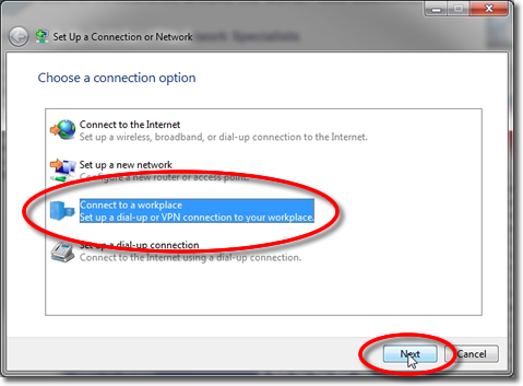 On the next screen, click on ‘Connect to a workplace’ then click ‘Next’.