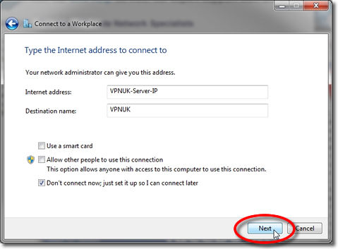 Enter a VPNUK IP Address and ‘Destination name. Ensure that the checkbox labeled ‘Don’t connect now; just set it up so I can connect later’ is checked. Then click the ‘Next’ button. You can find the server information in your ‘Welcome to VPNUK’ email or in the ‘Client CP‘ on the VPNUK website.
