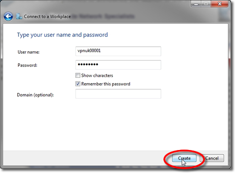 Enter your VPNUK login username and password. Optionally, check the ‘Remember this password’ checkbox, then, click the ‘Create’ button.