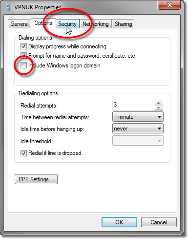 Remove the tick from the ‘Inlclude Windows logon domain’ dialing options and click onto the ‘Security’ tab.