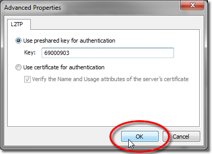 In the ‘IPsec Settings’ dialog, click the radio button labeled ‘Use pre shared key for authentication’. Then type 69000903 into the text box labeled ‘Key’. Then click the ‘OK’ button.