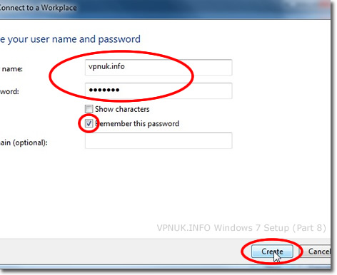 Enter your VPNUK login username and password. Optionally, check the ‘Remember this password’ checkbox, then, click the ‘Create’ button.