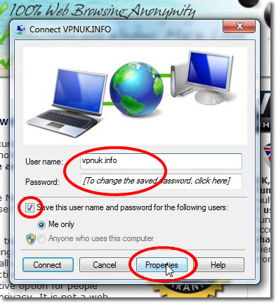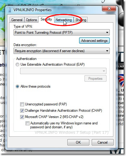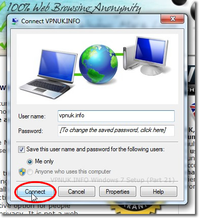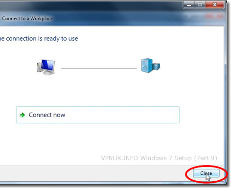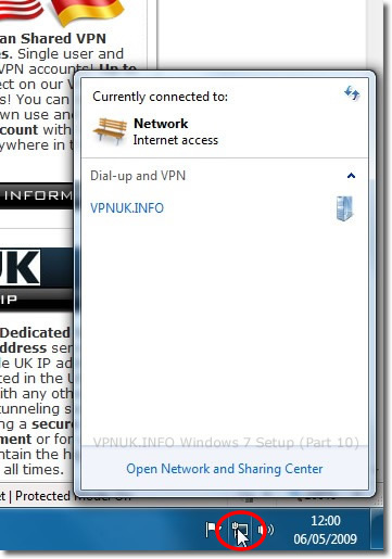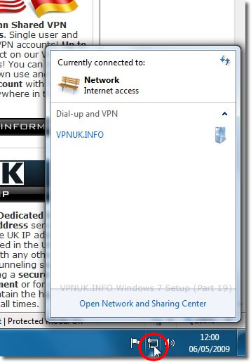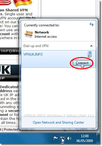 In the ‘Currently connected to’ screen that has just appeared, you should see the VPNUK.INFO connection that we have set up. Click on the connection and then click onto ‘Connect’.