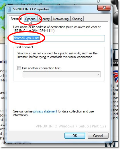 Enter a VPNUK IP Address and’Destination name. Ensure that the checkbox labeled ‘Don’t connect now; just set it up so I can connect later’ is checked. Then click the ‘Next’ button. You can find the server information in your ‘Welcome to VPNUK’ email or in the ‘Client CP‘ on the VPNUK website.