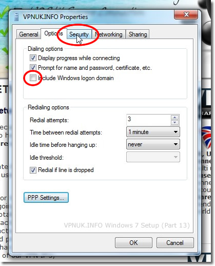 Remove the tick from the ‘Inlclude Windows logon domain’ dialing options and click onto the ‘Security’ tab.