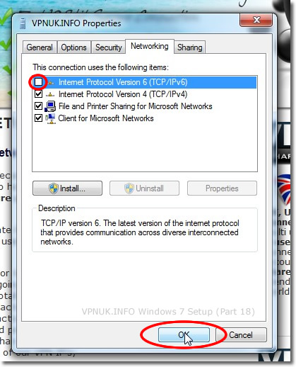 Uncheck ‘Internet Protocol Version 6 (TCP/IPv6)’ from the connection items selection and click the ‘OK’ button.